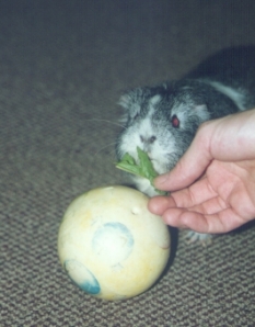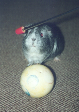 Hallo liebe Meerschweinchenfreunde, auf den folgenden Seiten könnt Ihr Fotos sehen von lernenden Meerschweinchen. Tja, die liebe Technik. Mein Scanner ist dabei, sich zu verabschieden und führt ein sehr selbständiges und bisweilen mysteriöses Eigenleben. Er scannt, was er will und wie er will. Mal in Farbe (so sollte es auch sein), mal in schwarz/weiß (warum auch immer, er verrät es mir nicht) oder dann, ganz poppig: In Blautönen mit blauen Längsstreifen. Oder wie eine Rauhfasertapete. Das Scannen war also eine spannende Angelegenheit, ich hatte mir fest vorgenommen, mich nicht aufzuregen, und deshalb dürft Ihr Euch bitte nicht wundern, wenn einige Fotos in schwarz/weiß sind:-) Ich hab es akzeptiert, wie Herr Scanner es mir gegeben hat. Meine Meeris haben keine roten Augen, aber das auch noch auf den wenigen Farbfotos zu retuschieren, hätte mein Scannprogi nicht mehr mitgemacht. Noch für alle, die tierschützerische Bedenken haben, so sind die Fotos entstanden: Ein Stativ, ein Blitzlicht, ein batterieloser und somit nicht funktionstüchtiger Fernauslöser, also war eine Hand suchend an der Kamera. In der anderen Hand der Targetstick und auf einem Stuhl meist griffbereit die Belohnung: Frischer Löwenzahn. Die Meerschweinchen haben aus freien Stücken mitgemacht, hatten Fress- und andere Pausen. Wichtig für alle, die das auch machen wollen mit ihren Meerschweinchen: Es ist alles nur ein Spaß, nichts ist ernst, es besteht kein Grund für Ungeduld, Überforderung oder sonst etwas. Deshalb trenne ich meine Meerschweinchen nicht während des Übens. Ich will Euch nur zeigen, was Meerschweinchen so drauf haben:-)) Und hier nun die Fotos. Würdigt sie, der Scanner hats nicht gern getan.