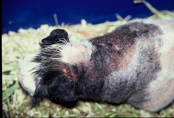 Notschwein Sally bekam ich im September 2003 in diesem Zustand (Foto aufgenommen nach dem TA-Besuch, sie mußte geschoren werden). Sie litt an Milbenbefall, durch die lange Zeit, in der er nicht behandelt wurde, hatte Sally zahlreiche blutige Wunden, die gesamte Haut war entzündet und sie hatte stündlich Krampfanfälle.